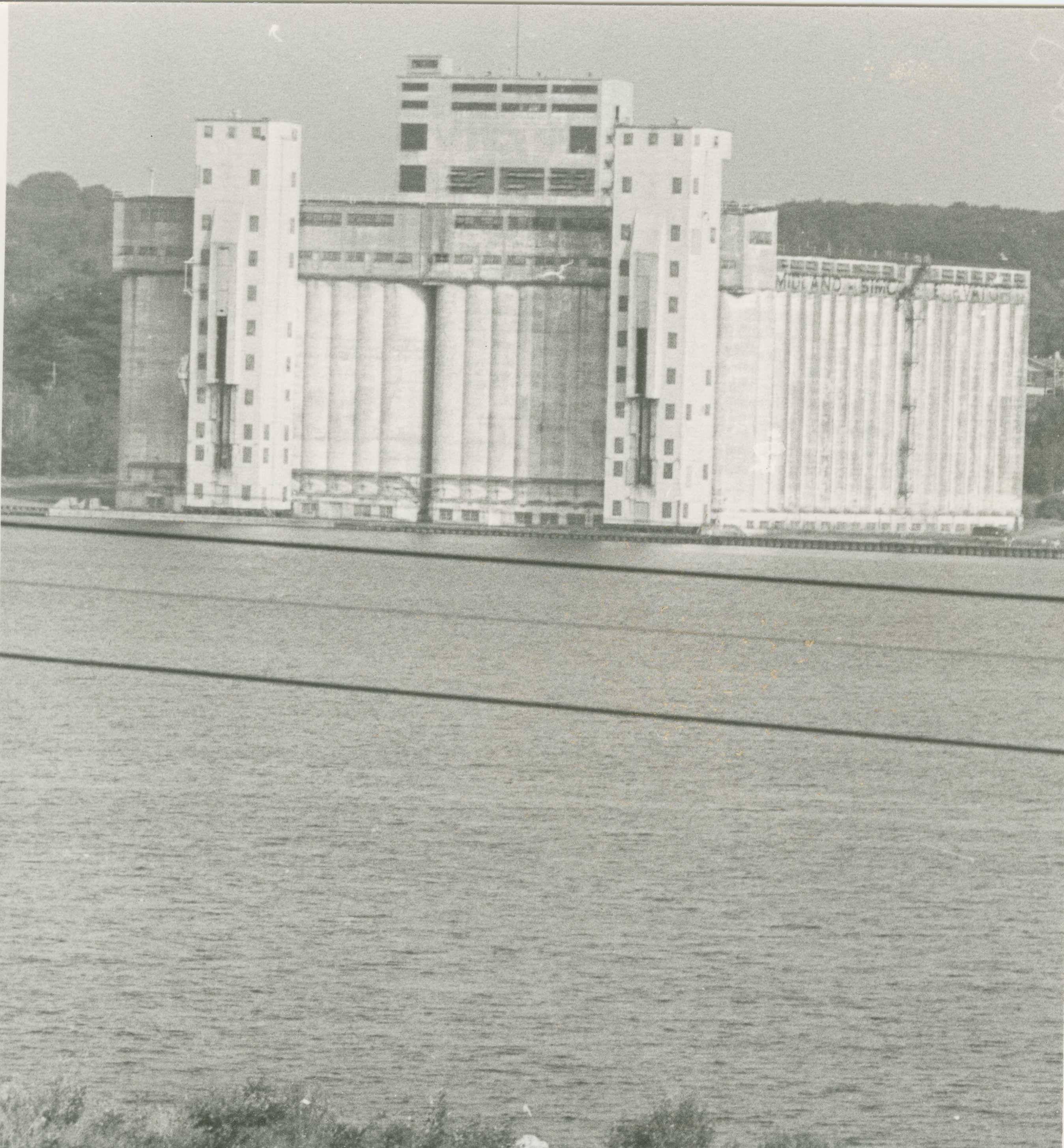 Early photo of the current Midland Grain Elevator (now owned by ADM Mills), and the Copeland Flour Mills. Photo taken by local photographer J.W. Bald.
