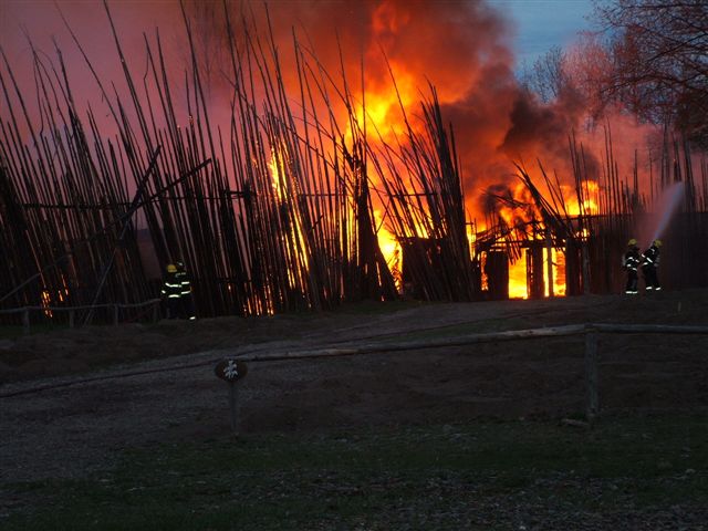 The fire at the Wendat village on May 8th of 2007. The village has since been rebuilt with a few changes, most notably only one longhouse was replaced. The village will be officially reopened in the Spring of 2014 with a new entrance and new interpretive panels.