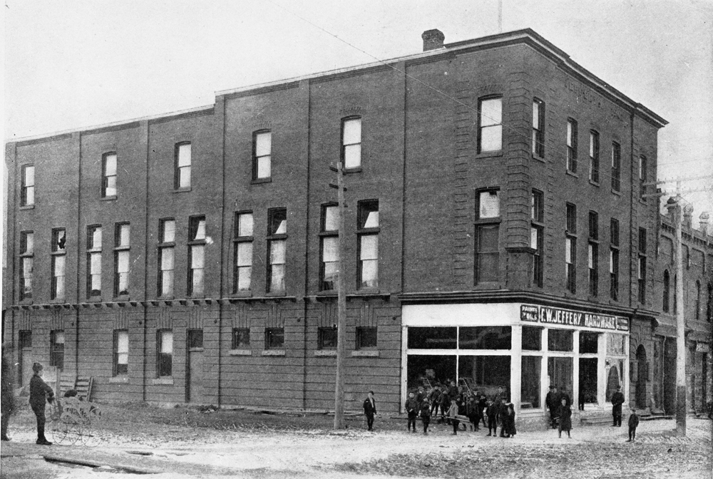 The Jeffery Block, as this building is known, was completed in 1901 and housed the hardware business of F. W. Jeffery & Sons. The second storey of the building was the home of the local Y. M. C. A., while the top floor was out fitted for the Odd Fellows Lodge meeting rooms. The third floor was also used for a time as the High School quarters until the completion of its building in 1904.