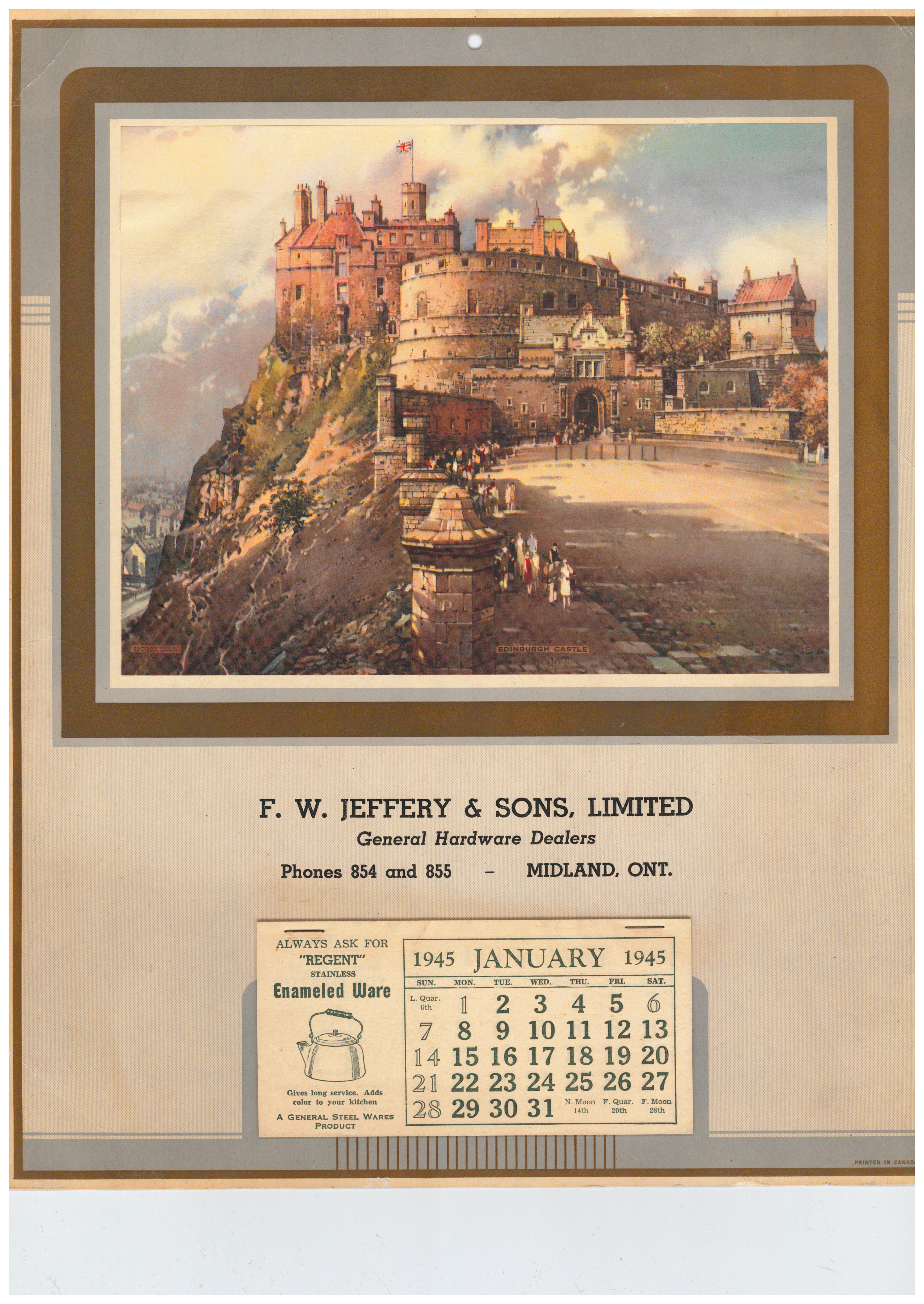 Advertising Calendaer from Jeffrey Hardware C.1945. Calender’s were a popular advertising medium. everyone needed one in the house. Various pictures were used to appeal to their customers including babies, puppies, glamorous women, and in this on, scenes of exotic places, Edinburgh Castle.