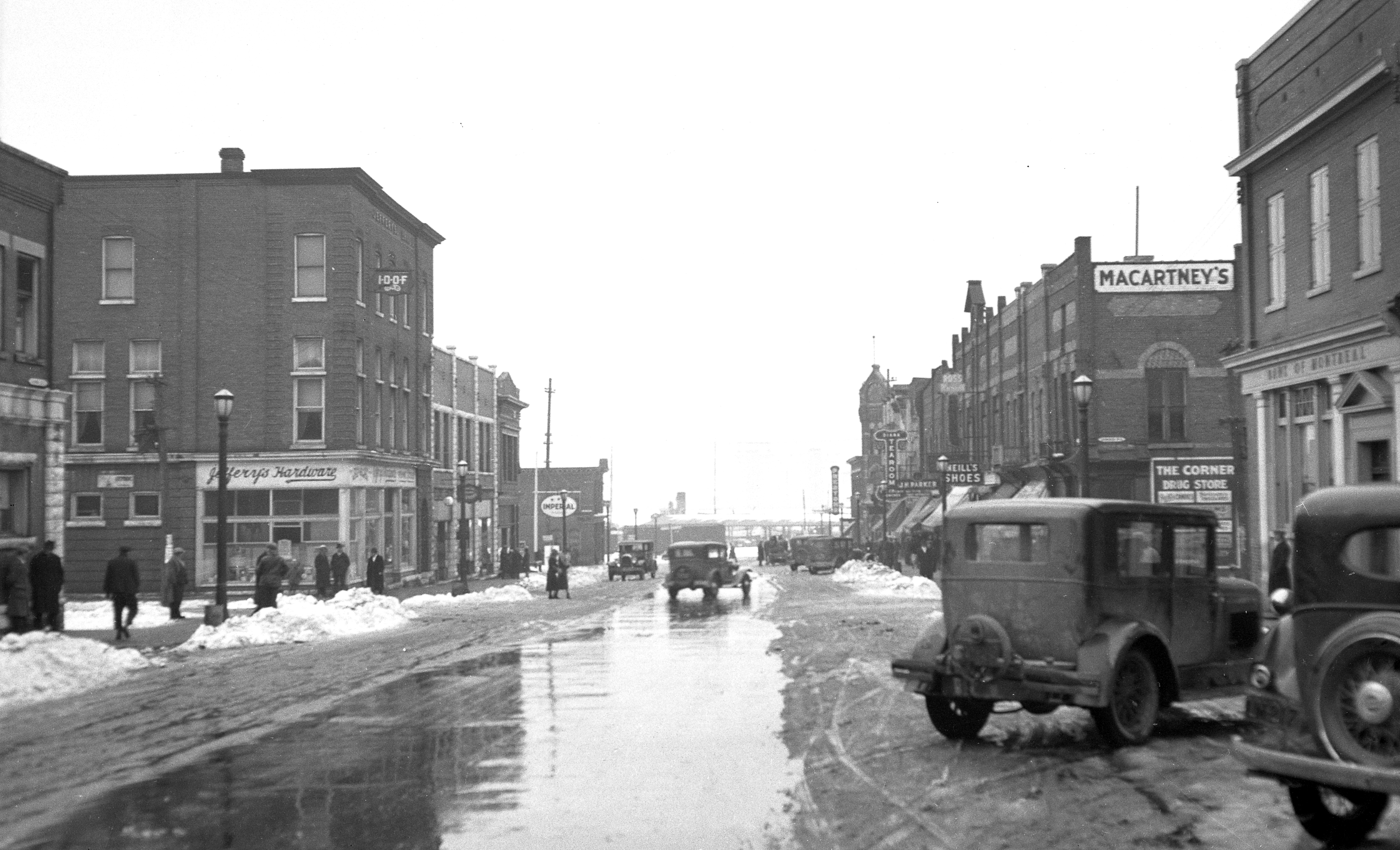 The lower part of King St., near the intersection with Hugel Avenue. The Jeffery Block is on the left side of the photo. Jeffery’s Hardware occupies the lower floor of the block.