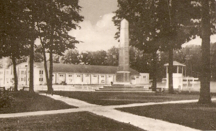 A complete picture of the Midland Arena Gardens as seen behind the Cenotaph, located on King St., adjacent to the Midland Curling Club.