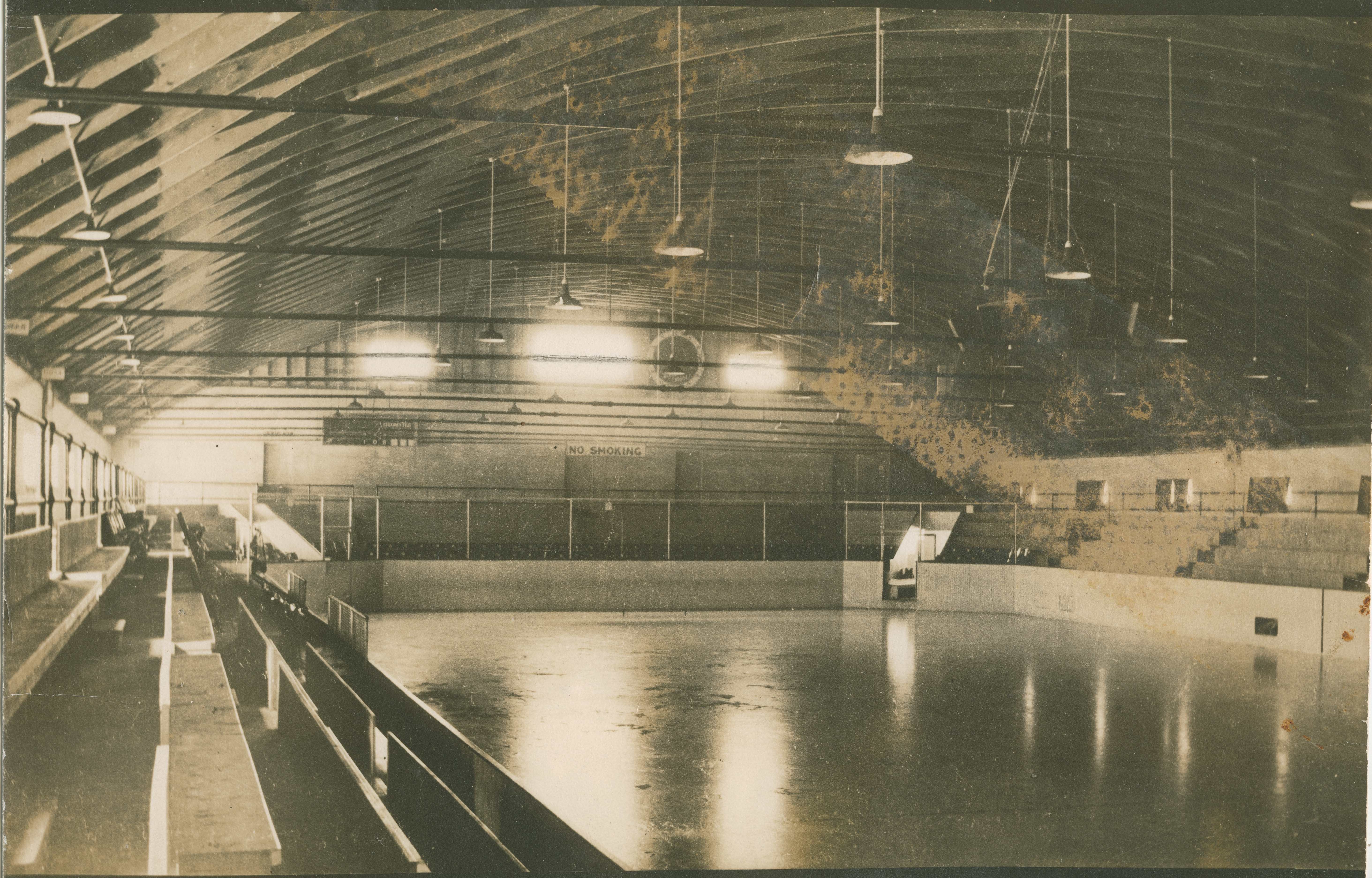 Another view inside the Midland Arena Gardens with a better view of the state-of-the-art roof. Photo by J.W.Bald. Caption reads “Midland arena, seating 1500, ice-75″X180″- Up to date seating plan, shower baths-restrooms-skaters rooms-restaurant-telephones-and exceptionally well lighted throughout. Photo by J.W. Bald Midland 1932.”
