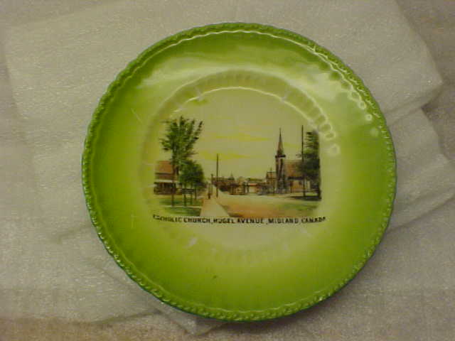 A souvenir dish of St. Margaret’s. The dish says “Catholic Church, Hugel Avenue, Midland Ontario”. The Huronia has many such souvenir dishes from the Huronia area in its collection.