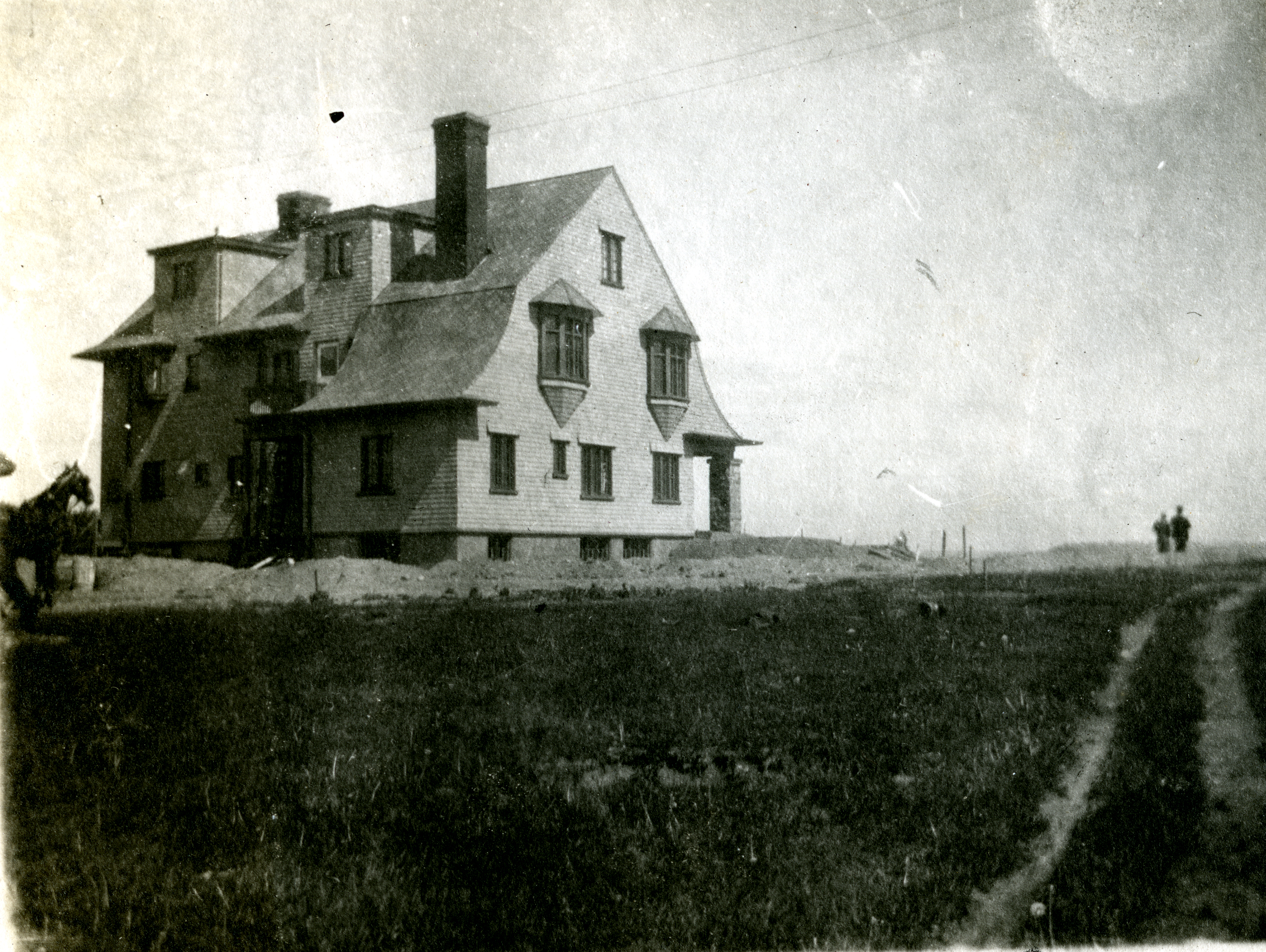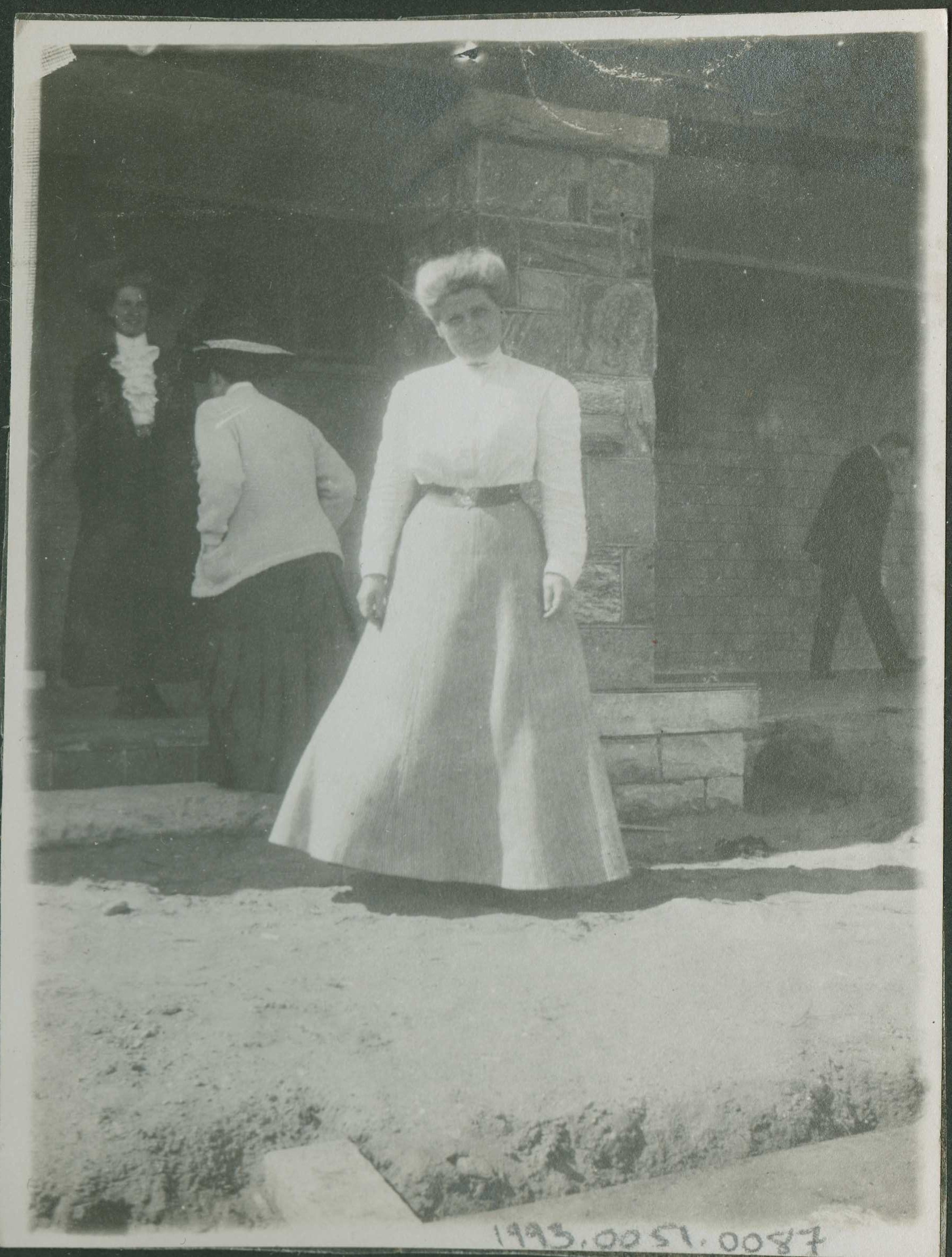 the Hostess of Georgian Lodge, Mrs. Drummond in front of the house during construction.