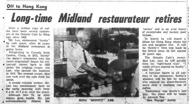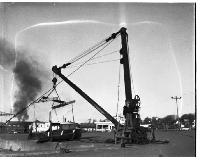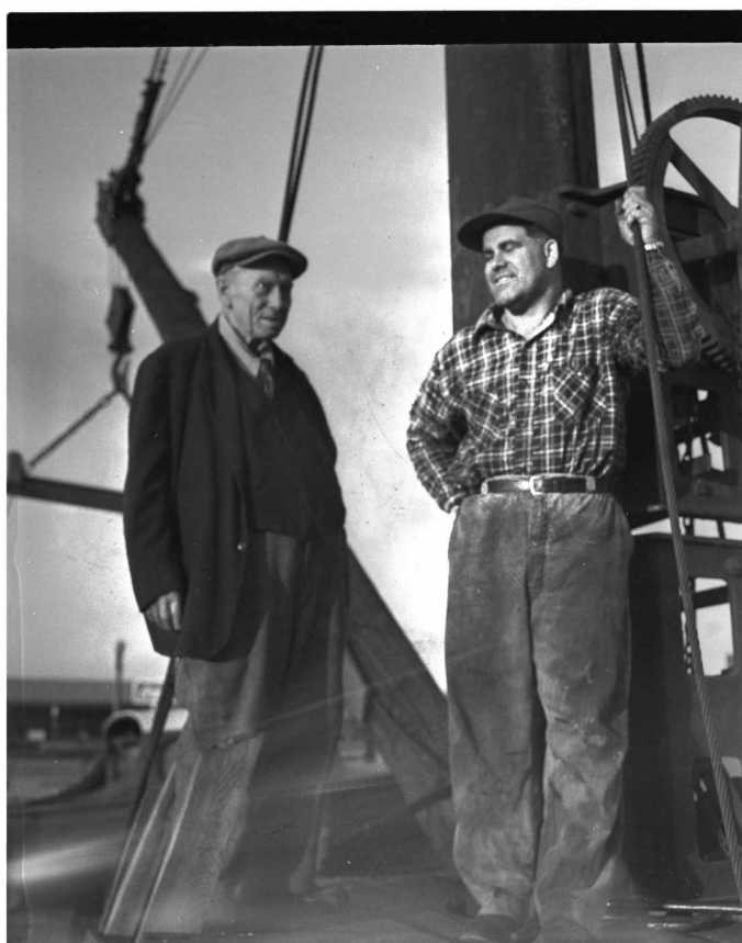 One of Midland’s few remaining links with the last century, Samuel Cyrus (Bert) Hanly died in St. Andrew’s Hospital Friday, in his 89th year. Mr. Hanly had been a familiar figure the town’s waterfront for many years. He was also one of its most avid hunters and was still going to deer-hunting camps till recently. Rev. J. L. Self conducted funeral services at Nicholls funeral home Monday. Interment was in Lakeview Cemetery vault. Pallbearers were Len Cowdrey, Robert Bell, W. D. Strathearn, Charles McElroy and Capt. Dick Smith. Born at Waubaushene Sept, 30, 1873, Mr. Hanly was the son of the late Dr. John Hanly and Mrs. Hanly. At that time the nearest doctors were in Penetang, Orillia and Hillsdale. One of three sons, Bert got what schooling he could at Waubaushene and also distinguished himself by going through high school without attending any classes. He appeared there only to write examinations. Next step was the School of Practical Science at the University of Toronto where he took a three year course. He came to Midland Jan. 6, 1896, and set up the Midland Engine Works with his late brother, Bruce Hanly. The building, near the CNR station, is now part of Midland Foundry and Machine Ltd. During World War I they made six-inch shells. The firm’s chief customers were the Playfair enterprises, CPR, and the shipyards. Mr. Hanly closed up shop in 1938, a year after his brother’s death. For many years after that he continued to operate the eight-ton crane on the waterfront. He hand-cranked up hundreds of small boats for repair or winter storage, launching them again in the spring. He continued to operate the crane until the fall of 1956 when he sold it to Lloyd Atkinson (pictured below with Bert). The crane was built around 1917. That same year, 1956, when he was 83, he was still going to the hunting camps with such old friends as the late J. W. Bald and J. A. Benson.