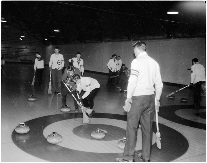 There was plenty of broom action in the Ontario schoolboy curling championships in Midland Saturday. Above is a view of the action in the final game between Banting Memorial of Alliston and North Hastings High School, Bancroft. Banting won 18-6 and will represent Ontario in the Canadian finals in Halifax next month.