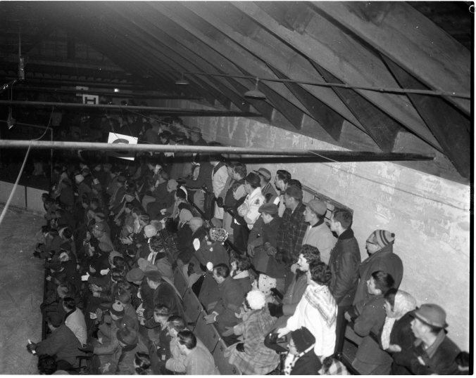 The more than 1,500 fans at the Midland-Collingwood game Wednesday night were on their feet most of the night cheering the torrid action, by both teams. A portion of the crowd is seen above as Flyers bombarded veteran Harry Lumley in the first period. Flyers won 6-4.