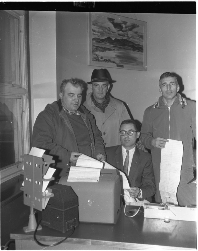 This huge “get well” telegram should help cheer up George Westfall as he recuperates in Oshawa General Hospital following eye surgery. One of the Midland Flyer’s most popular players this year, Westfall suffered a severe eye injury in a game in Midland three weeks ago. Watching CN telegraph operator Bill Mitchell send the seven foot long message are left to right, Norm Savage, “Rinks” Switzer and Clare Allsopp.