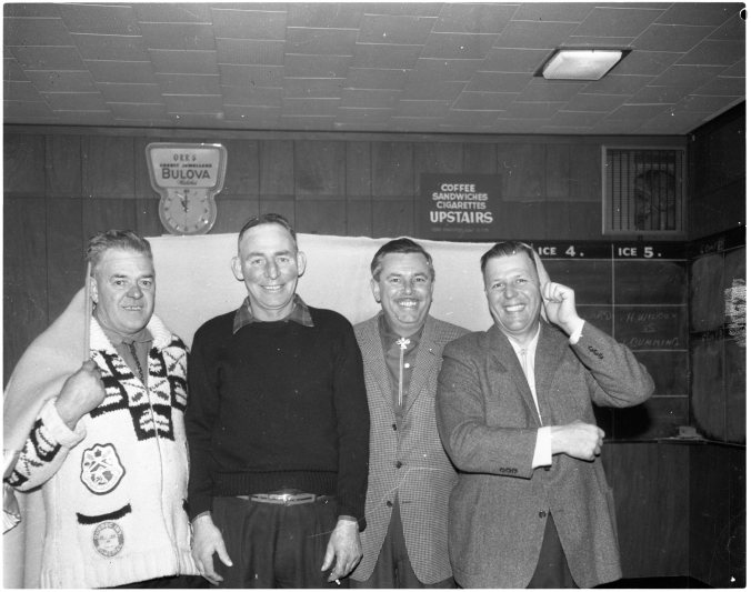 These four Midlander’s can sing “Under a blanket of blue” after receiving one each as second prize at the one day bonspiel staged by Midland Curling Club Saturday. Left to right are; skip Armand Robillard, “Woody” Woodrow McConnell, Jim Moss and Les Barber.
