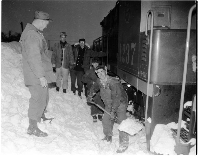 Monty Sinclair, CNR road master for Midland and district, was riding in the spreader plow last Friday near Perkinsfield when it derailed. (Man on left facing away.) The man with the shovel is Leo Moreau and behind him is Renee Parent, both from Perkinsfield. [Identified on Facebook by Drew Parent and Melissa Moreau. Guy Moreau said the two men worked at the Collingwood shipyards for years and travelled back and forth together.] Behind them leaning on the engine is Alderic Moreau aka Al or Joe, who lived on the 11th Concession of Tiny near the track, identified by his daughter Kelly Donaldson.