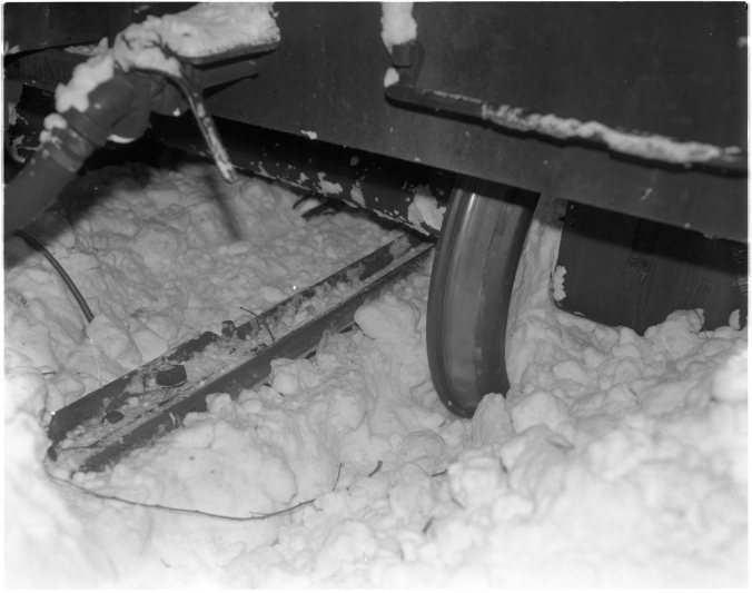 Pictured is one of the rear wheels of the CNR snow spreader derailed near Perkinsfield Friday. Along with a 114-ton diesel locomotive it left the tracks when they encountered 20-foot high banks of snow along the right-of-way between Allandale and Penetang. It took railway crews over a day to free the stranded equipment.