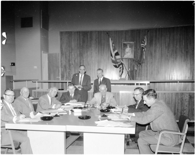 Midland’s 1962 re-assessment brought a record number of appeals for the court of revision to handle last week. Seen near the end of Thursday night’s five-hour sitting are, left to right (seated) Wm. Jeffery, R. S. McLaughlin, Clerk W. A. Hack, Assessor Ian McClung, chairman Gordon Boyd, John Burke and Fred Hook. Standing are Eric Simpson, county assessor, and Wm. Scott, building inspector.