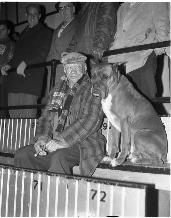 “What’s the hold up?” says Charlie Coomb’s canine friend as the two await the start of Wednesday night’s Barrie-Midland game at the Arena Gardens. The game was held up for an hour when no referee showed up. Charlie and his friend had lots of chance to cheer later as the Flyers chalked up a 7-2 win. [As we scan these hundreds of local photos, favourites emerge, and this is one of them.]