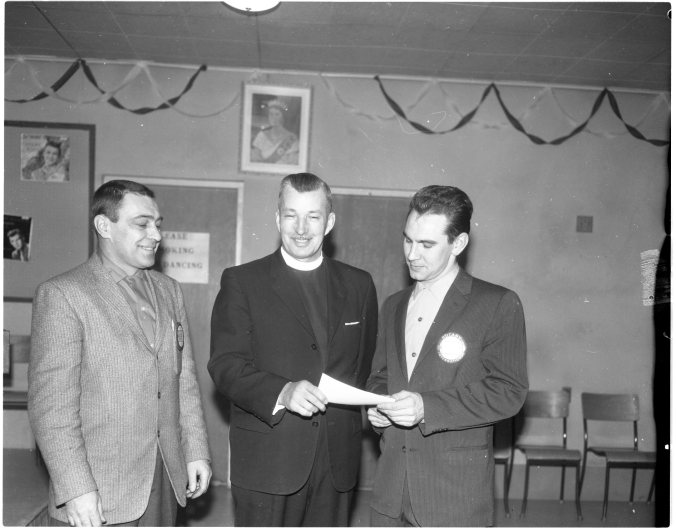 Two Midland organizations got financial boosts from the Midland Rotary Club at the latter’s dinner meeting Tuesday night. Rev. Len Self is seen accepting a cheque for $50 to help carry on Little NHL programs from Rotarian’s “Chuck” Stelter left, and Bob Scott.