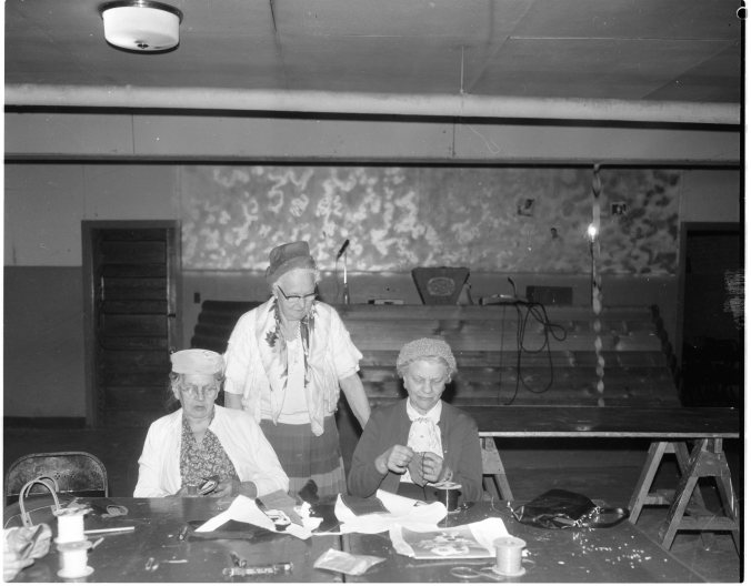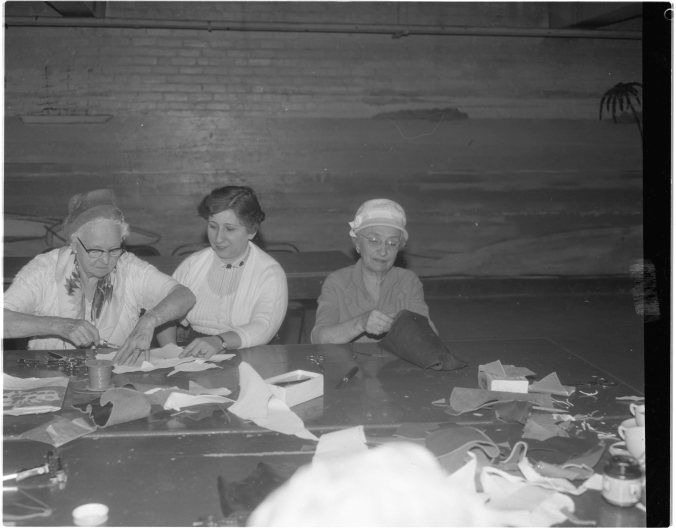 Being taught to make several kinds of purses and other leather goods by instructor Mrs. H. J. Brown, centre, are two of Midland’s senior citizens, Mrs. E. M. Salisbury, left, and Mrs. Ray Ruggles. Classes are held every Wednesday from 2 to 4 p.m. at the YMCA. As well as leather work, several other courses are on the agenda including dressmaking, sewing and pattern making.