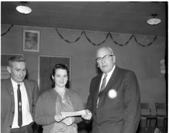 Mrs. Jack Banks, president of the Huronia Retarded Children’s Association, receives $100 cheque from Rotary members, Jim Henry, left, and Lorne Garrow.