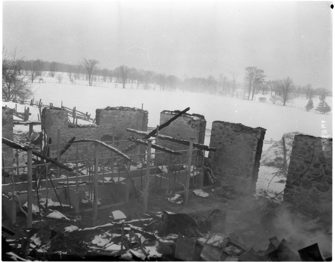 Smoking ruins are all that is left of this big barn on the Tom Blair farm in Tay Township, near Ebenezer. Fire completely destroyed the barn and the field crops inside but neighbours helped Mr. Blair remove all the stock except 100 rabbits. The fire occurred early Friday morning.