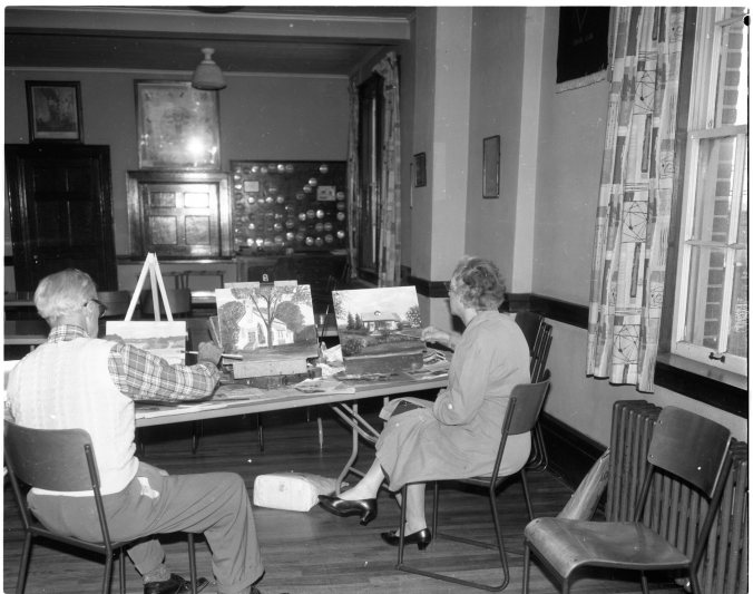 Another of the many activities carried on at the Y is an art class Monday and Thursday afternoons under the direction of Duncan Armbrest of Midland. The course lasting six weeks is open to anyone who would like to learn the basic rules of painting. In the above photo Mr. Armbrest is showing Mrs. D. Leigh the proper way to touch-up some light shading. Anyone interested in art is asked to get in touch with Dave Docherty at the Y.