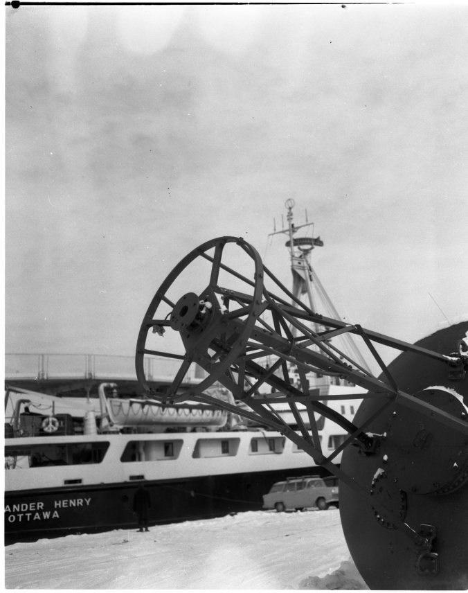 “Out of Service” editorial page photo. A ’loiterer’ is the subject of today’s editorial page picture. It is one of the buoys that hangs around Midland dock from late fall until early spring. In the background is the Canadian government ship Alexander Henry.