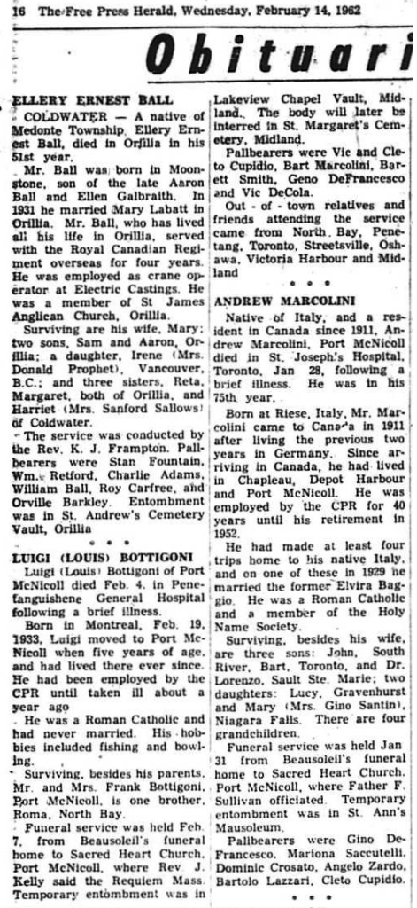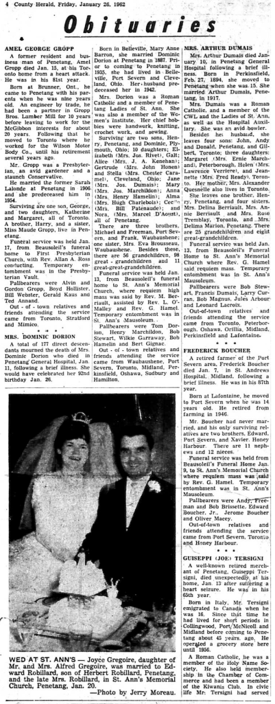 MRS. ROBERT CARSON – A lifetime resident of Midland and district, Elsie Sarah Carson, widow, of Captain Robert Carson, died in St. Andrews Hospital, Midland, Jan. 3 following a brief illness. Daughter of Thomas and Eliza Smith and a member of one of this area’s pioneer families, she was born in Tiny Township Jan. 14, 1885. Although a Presbyterian most of her life, Mrs. Carson was the first baby on the first cradle roll of St. Mark’s Anglican Church, Midland, to be christened. She attended school in Tiny. On June 27, 1912, in Penetanguishene, she was married to Captain Robert Carson. He predeceased her in May, 1944. She was a member of Knox Presbyterian Church, of the Eastern Star, Midland Horticultural Society, the Midland Women’s Progressive-Conservative Association, and served several terms as a committee member of the flower section of Tiny and Tay Agricultural Society. She was active in the work of Knox Church W.A. Her main interests were her home and her family. Funeral service, conducted by Rev. J. L. Self, was held at A. Barrie and Sons funeral home Jan. 6. Temporary entombment was in Lakeview Cemetery vault. Burial will take place in St. Mark’s Cemetery, Midland. Pallbearers were William Salisbury, Frank Doherty, Al Bremner, Charles Scott, Bert Smith and John Mackie. Mrs. Carson is survived by sons Robert, Midland, and Verne, Sault Ste Marie, a daughter Ann, Midland, brothers Oliver H. Smith QC, Midland, and Edwin A. Smith, living on the original family homestead in Tiny, and a sister, Dora A. Smith, Toronto.