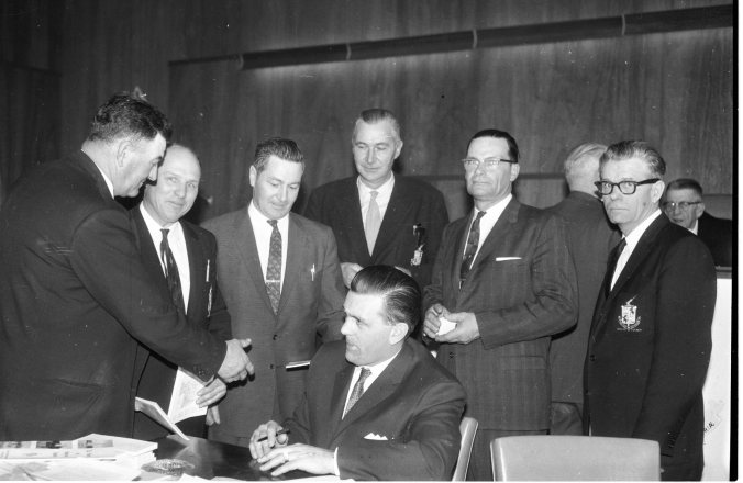 Visit of Montreal Canadiens’ famed Maurice “Rocket” Richard proved to be one of the highlights of last week’s sitting of Simcoe County Council. Councillors proved just as enthusiastic as school kids in getting his autograph. Line up, left to right are; Reeve Dalt Jermey, Medonte; Deputy-Reeve Bernard St. Amant, Penetang; Reeve Art Argue, Midland; Reeve Lawrence Devine, Coldwater, himself a former NHL player; and Reeve Montcalm Maurice, Tiny, who conveyed council’s greetings in French to the, “Rocket”. [The man on the right was not identified in the newspaper.]