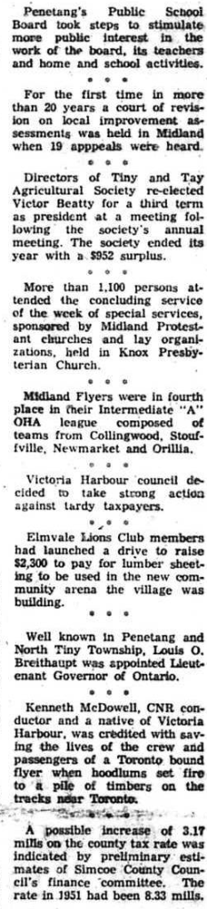 David Hurrie, member of the Midland Public Utilities Commission, was elected Georgian Bay District Director of the Ontario Municipal Electric Association. * * * “Publicizing the Town of Midland” was the topic of John C. Kirkwood, internationally famous advertising expert, when he spoke to a joint meeting of Midland Kiwanis Club, and Midland council and Chamber of Commerce representatives. * * * In appreciation of his many years of service to Knox Presbyterian Church, N. L. Playfair was presented with a purse of gold by T. C. Luke on behalf of the managers and congregation at the church’s annual meeting. * * * Following a petition signed by most Midland merchants, the town council approved the Wednesday half-day closing of stores during the months of January, February, March, April, May, September, October and November. * * * Midland council passed a resolution calling upon the federal and provincial governments to take over the cost of relief. * * * St. Mark’s Anglican Church Dramatic Society presented the comedy play “The Jonah” in the parish hall. * * * Due to the lack of snow, Midland’s second annual winter carnival had to be cancelled indefinitely. * * * Midland Garments Limited, left Midland and moved their factory to Montreal. * * * Midland council voted themselves indemnities of $5 each per meeting with the mayor receiving, $375 per annum. Aldermen V. G. Edwards and George Tatham voted against the indemnities and announced they had no intention of accepting any.