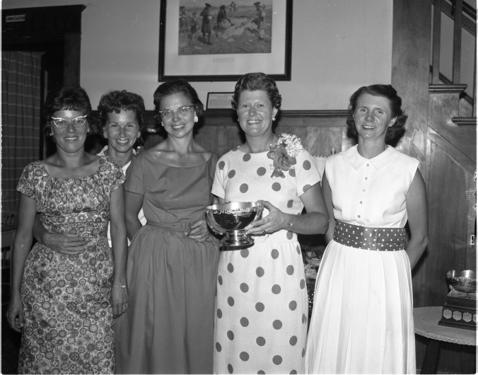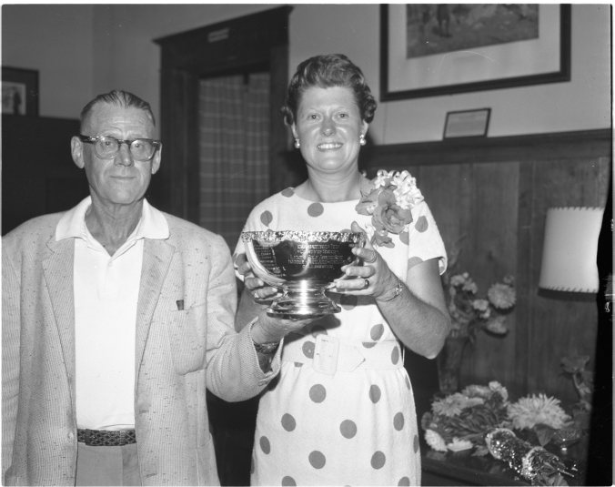 Winner of the fourth annual Simcoe County senior ladies’ golf championships held Thursday at Midland Golf and Country Club, was Mrs. Tilly Lambrick of Orillia. Mrs. Lambrick, left, is seen receiving her trophy from Mrs. R. S. McLaughlin, president of the women’s division of the Midland club. The event attracted 22 entries this year.