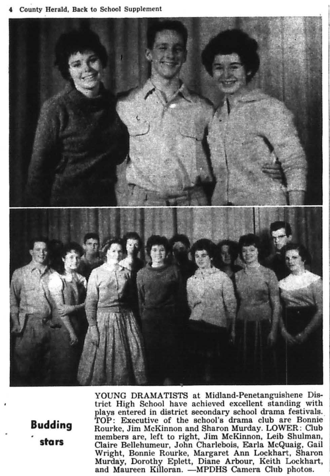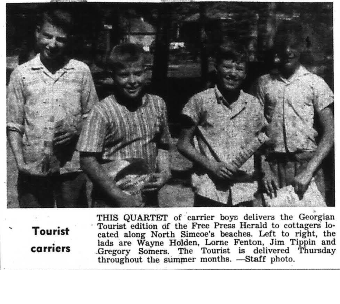 Midland mayor S. W. McKinley, in a public notice to landlords, informed them that shelter allowance would not be paid to newcomers to town for relief. If such family was on relief in the previous municipality. • • • The barn of Roger Brunelle, the largest in the village of Lafontaine, with all its year’s crop was burned to the ground when a threshing machine caught fire from a heated shaft and sent flame out of the blower to the straw mound. • • • A program of development, including a large L-shaped dock at Triple Bay, was started by Charles Beatty who took over the store and post office formerly operated by A. G. (Doc) Elson. • • • Mrs. Gerald Powell of Araan, Ohio, took an hour and a half to land a “muskie” at Delawana Inn. The fish weighed 41 ½ pounds, was 52 inches Iong and 24 inches in girth. • • • Bill Gerow, a thirteen-year-old Midland lad, won the Across-the-Bay swim at the Penetang Water Sports held as part of the Labor Day festivities. • • • Labor Day was celebrated by a program presented at the Midland town park, by Midland Workers’ Association, Midland Longshoremen’s Union and the Relief Gardens Committees of Midland, Penetang, and Victoria Harbour . More than 3,000 people from the three towns attended the day’s activities.