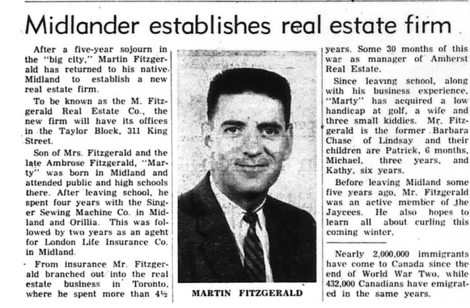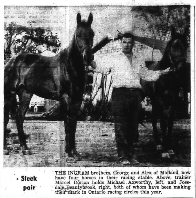 Four persons crawled out of an upside-down taxi in Midland Sunday morning, following a crash at Dominion Ave. and First Street. They suffered only minor bruises. Their cab, driven by Jack Lalonde of Penetang, was proceeding east on Dominion Ave., and was struck by a second taxi driven by Orville Bugg, of Midland and which was going north on First St. According to eyewitnesses, Lalonde’s car skidded, then rolled upside down on the pavement. His passengers were Mrs. Peter Lacroix, Penetang, her son, Pte. Alcide Lacroix, on leave from Camp Borden and William Minard of Midland. Chief Wm. McDonald of Midland investigated.