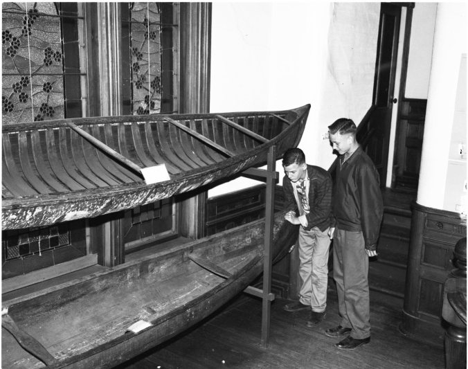 Boys and boats go pretty well together on land or water. Bill Argue and Keith Craig cast critical eyes on two canoes on display at Huronia Museum Midland, now in the midst of another busy season.