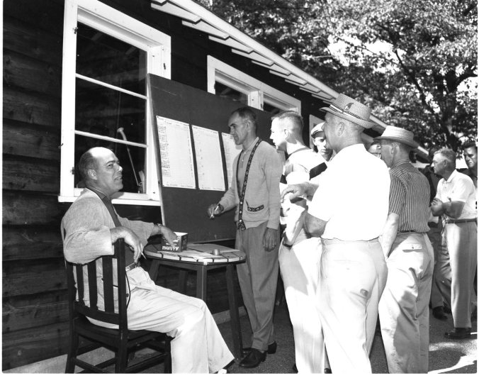 For a change, the weatherman provided perfect weather for the 96 golfers who took part in the Simcoe County invitation match in Midland Sunday. Players check their starting times with Don Argue and Ted Brodeur (at board).