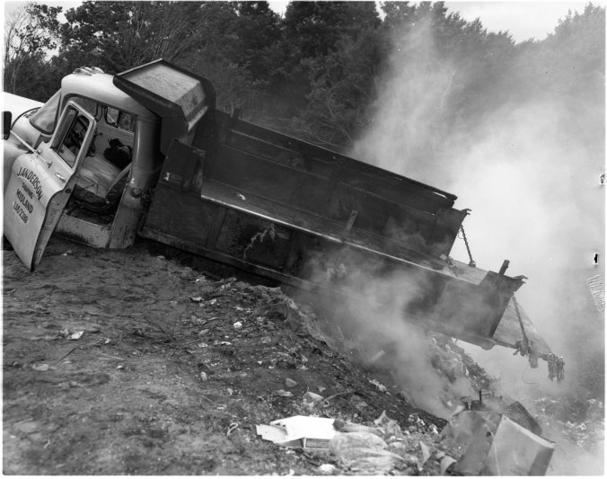 More than $200 damage was caused to this truck, owned by James Anderson, Midland, when it backed too close to the edge of the town dump shortly after noon Friday. The smouldering dump fire blew out and completely destroyed the left rear dual tires. The electrical wiring was also damaged. Midland firemen were called to the scene and it took two tow trucks to pull the vehicle back up on to solid ground.