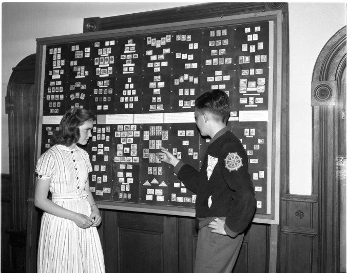 Termed a “stamp collector’s dream” is this collection of more than 400 commemorative stamps issued by the Red Chinese government from 1949-59. It’s on loan to Midland’s Huronia Museum by Frank Ridley, well-known Toronto contractor and amateur archaeologist. Fred Hacker points out some of the more valuable specimens to Carolyne Brownlee as the Parkview School students visited the museum recently.