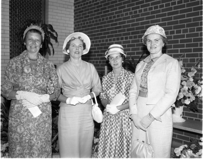It was a big day for the ladies, as well their councillor husbands, when the new Simcoe County building was officially opened by Premier Leslie Frost in Barrie Thursday. Among the women in attendance from this area were, left to right, Mrs. H. J. Beauchamp and Mrs. William Orr, wives of Midland’s reeve and deputy-reeve, respectively; Mrs. Ray Atkinson, whose husband is Tay Township’s deputy-reeve; and Mrs. Montcalm Maurice, whose husband, reeve of Tiny Township, has been a member of county council for 15 years.