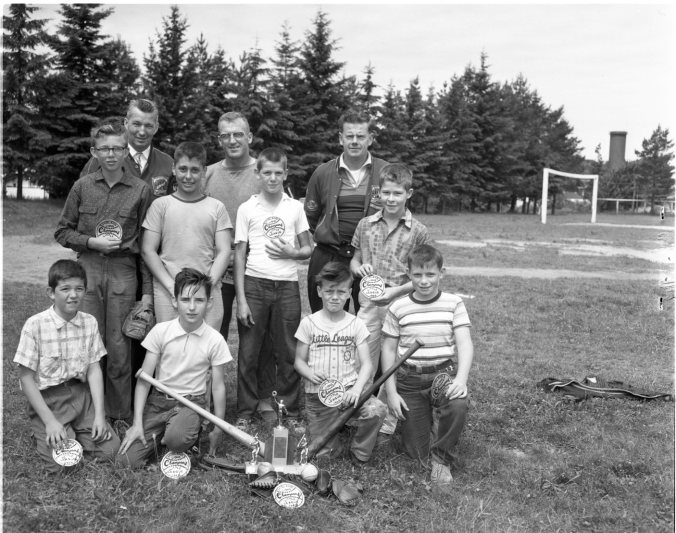 These lads formed the winning batteries in the finals of Midland’s Little League Baseball League Saturday. From the International League, front row, were, left to right, Raymond Dorion, Bill Smith, Doug Gagnon, Ron Henderson, National League, second row, were Bruce Cossar, Art McComb, Richard Duval and Bob Clayton. Helpers at back are Len Self, league director, Fred Scott and Frank Graham.