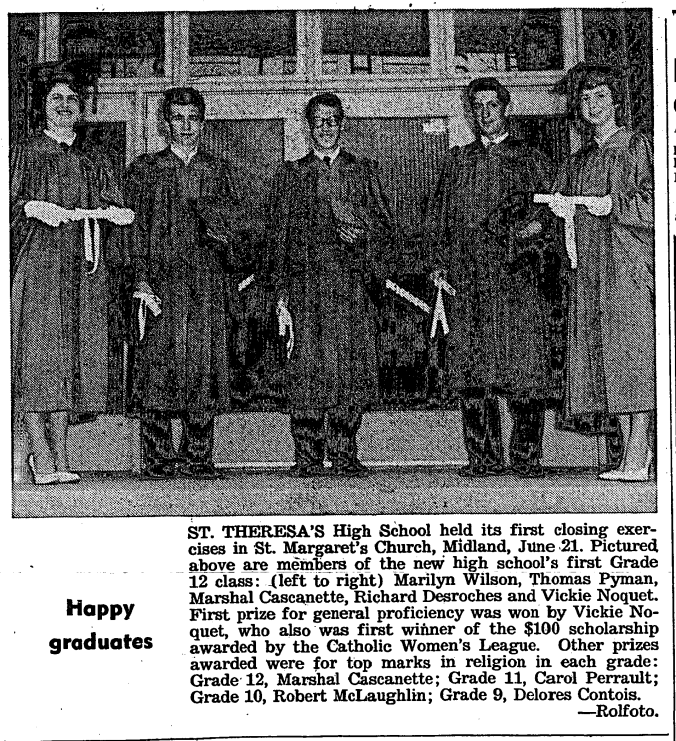 For the first time in the history of this district, a high school graduation will be held in June instead of October. This was revealed by Midland-Penetang District High School Principal R. C. Gauthier Wednesday afternoon, when he was commenting on the MPDHS graduation June 29 at the school. A total of $1,195 in scholarships and honor pins has been donated by industries, merchants, service clubs, individuals and the staff and Students Council at MPDHS, Mr. Gauthier stated. Explaining why the date had been changed from October to June, Mr. Gauthier said, by October a number of the graduates have left the district and therefore the attendance is poor so we have changed it to June when most of the graduates are still here. We hope it will be more successful because of the increased interest of students and parents.” The principal had praise for his staff when he added, “It is much more work to have it in June because, as well as marking examination papers the staff has the added job of attending meetings to plan graduation. We hope it will be successful and worth the additional trouble.” Mr. Gauthier said he expects that approximately 300 students will “pass across the graduation stage” during the evening.