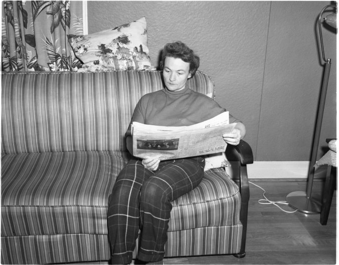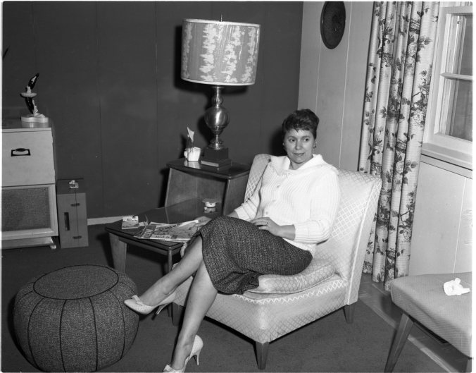 A winner in the Free Press Herald’s “Pick the Fashions” contest seen relaxing in her Midland home, is Mrs. J. Lesperance òf 381 Bay Street.