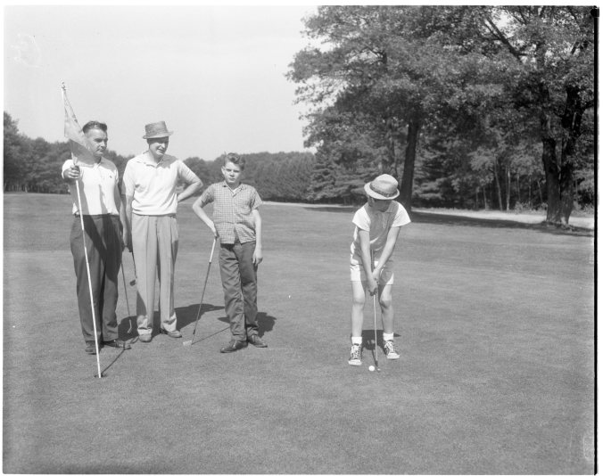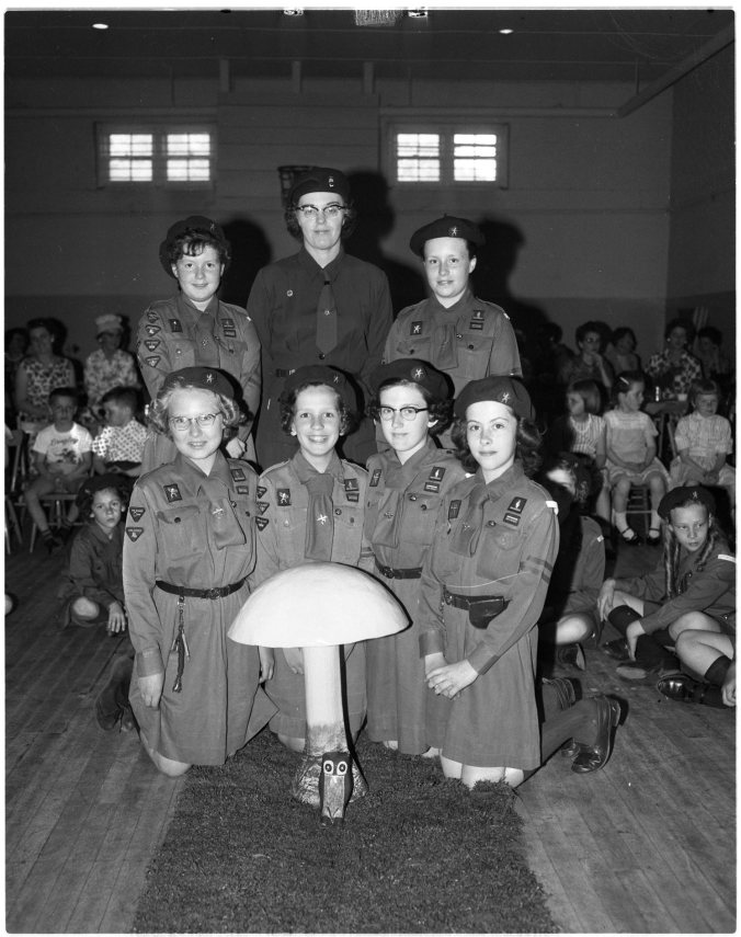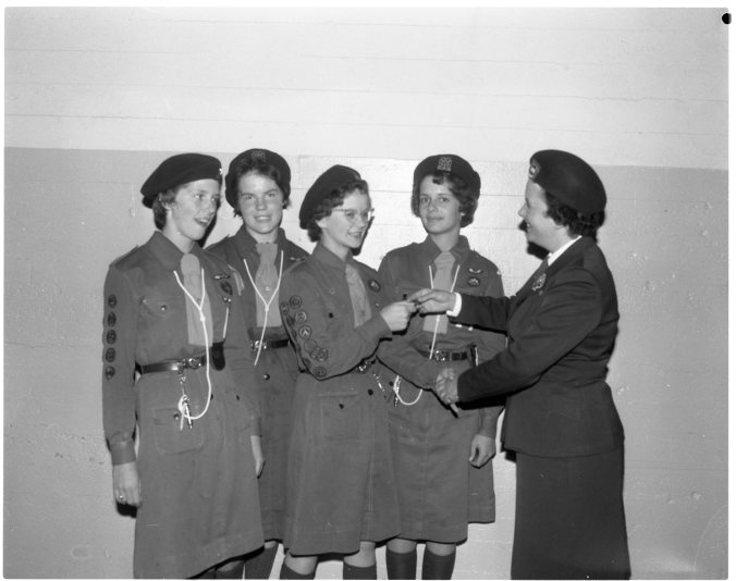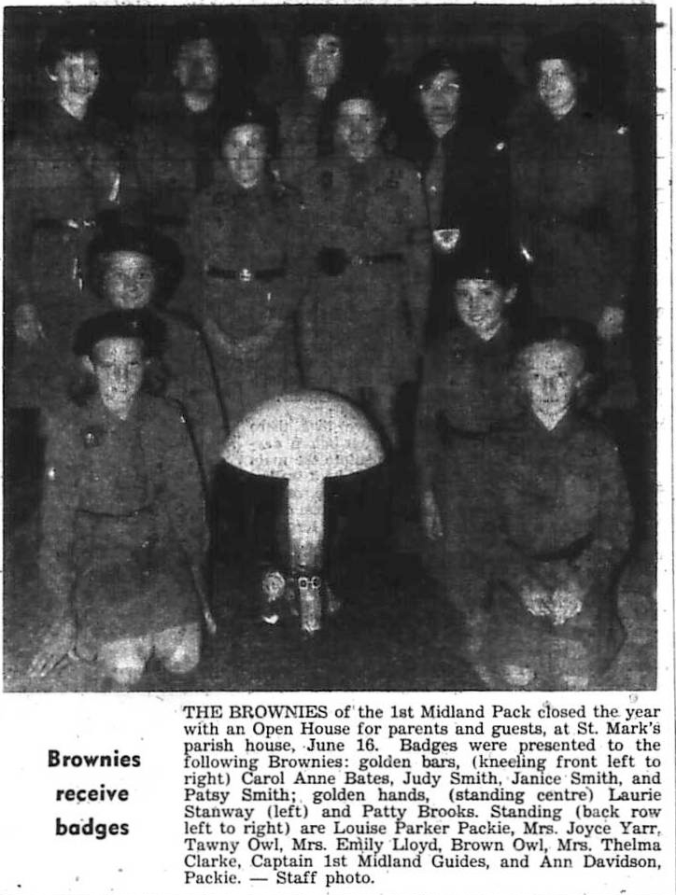 For the first time, the 1st Midland Girl Guide Company has first class badge holders’ in its midst. At the mother and daughter banquet, June 20, Mrs. J. E. Lawlor, Area Commissioner (right) presented the badges to these four girls; (left to right) Louise Parker, Barbara Galt, Brigit Neuman, and Sharon Stelter.