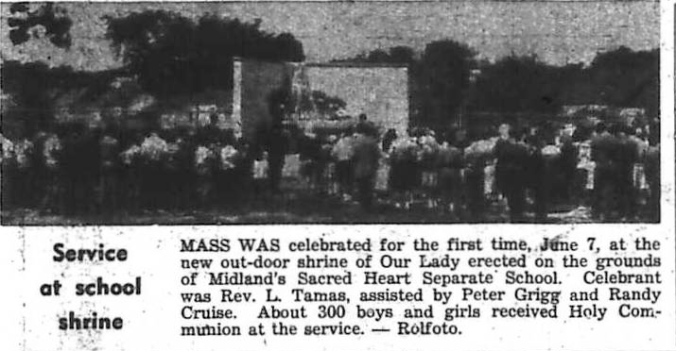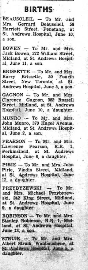 A well-known retired Midland school teacher, Miss Hazel Healey died at St. Andrews Hospital, Midland, Monday morning. Funeral service, conducted by Rev. J. L. Self, was held in Knox Presbyterian Church at two o’clock this afternoon. A native of Parry Sound, Miss Healey, at an early age moved with her parents to Midland. She obtained her teaching certificate at Peterborough Normal School, and began teaching at the Waverley Public School. She taught In Midland Regent School from 1920 until her retirement in 1960. Miss Healey was a past president of the local teachers’ council and held various offices in the local Women Teachers’ Association. She was an active member in many activities at Knox Presbyterian Church, and also was keenly interested in the Midland Canadian Club and the work of the Canadian National Institute for the Blind. Miss Healey, daughter of the late Mr. and Mrs. Matthew Healey and is survived by two sisters. Miss Noreen Healey, Midland, and Daisy, Mrs. Garland Poole, Peterborough. A brother, Charles, predeceased her during the first World War. Frank Bray, chairman of the Midland Public Schools Board, said “She was considered one of Midland’s best teachers. The death of Miss Healey is a not only a great loss to the teaching profession, but also to the town of Midland.