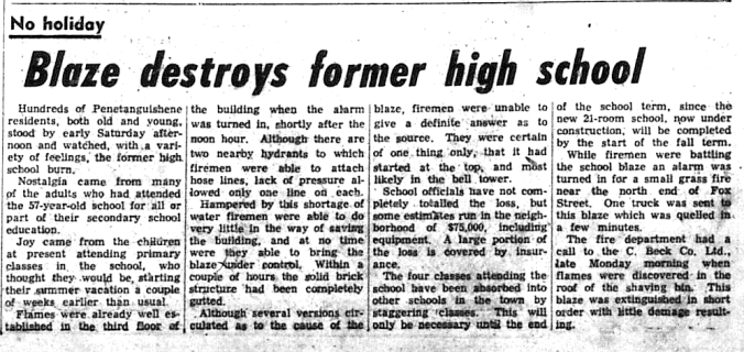 Although hundreds of thousands of gallons of water have been poured onto a burning swamp in Penetanguishene, the flames appear to be dampened little, and continue to smoulder under the surface. The fire is burning in a swamp area between the railway tracks and the bay. Town officials are apprehensive that children might get into difficulties if they happened to stray into the area. Reeve Alf. Cage said this week he could well remember when the area had burned a number of years ago “It left deep holes that could swallow a man, where the fire burned under the surface.” he said. This particular area is pretty much sawdust filled from sawmills that operated here years ago. The fire is apparently smouldering in the buried sawdust. “I don’t think it will be entirely put out until the winter snow comes.” Mr. Cage said.