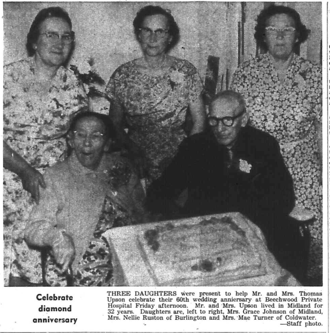 June 18 was a red letter day for Mr. and Mrs. David McGrattan, Eighth Street, Midland. It was their 60th wedding anniversary. All but eight of those 60 years have been spent in the brick home which Dave built for his young bride in 1910. Although the area all around is well built up now, it was on the edge of the bush in those days. It was natural it should be built of brick, for Mr McGrattan learned the brick-laying trade shortly after he came to Midland, some 74 years ago. He worked on many homes and other buildings in Midland as well as his own. Now 86, Mr. McGrattan was born in Dungannan, Huron County. He lived in Wingham and Owen Sound for brief periods before coming to Midland. Mrs. McGrattan, the former Bertha Elizabeth Jane Lyle was born in Coldwater. She also lived in Victoria Harbour for some years prior to her marriage to Mr. McGrattan, June, 18, 1902. The couple have two sons, Harold, of Orillia, and Jack, who resides in Kingston. They also have three grandchildren. Mr. and Mrs. McGrattan are members of Knox Presbyterian Church.