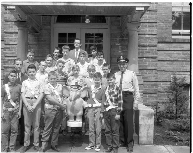 No doubt the effective operation of its school safety patrol had much to do with the return of Elmer, the safety elephant, to Bayview Public School last week. Sgt Ernest Bates (right) is seen with the 17 member patrol following the presentation. At rear is principal William Barnett. Ontario Motor League representative Norman Crane is at left of the picture. [Front row, L to R, Doug Atkinson, Terry Turner, Pat Neil, ?, David Banks. 2nd Row, Norman Crane OML, ?, Rob Stanway, Pat Dion, Brian Scott, Dan Carson, Staff Sgt. Ernie Bates. 3rd Row Marvin English, Pat Blanchard, Ted Carlton, Dave Weatherall and Buster Gibson. Back row; ?, Bill Barnett school principal, ?. Names supplied from a museum Facebook enquiry.]