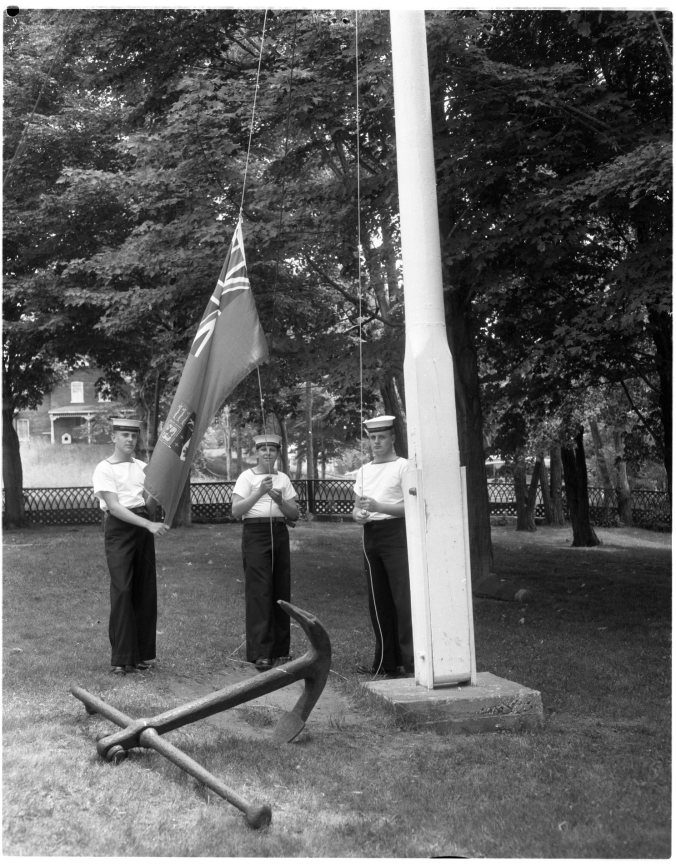 Members of RCSCC “Huron”, Midland, did a good turn recently by giving the flag-pole at Huronia House Museum a badly-needed paint job. Getting ready to hoist flag are, left to right, Fred Guthe, Bill Bannister and Hans Lorenz ( Hans Lorenz died in Vietnam while serving with the American forces, he was buried in Lakeview cemetery. An American military honour guard attended.).