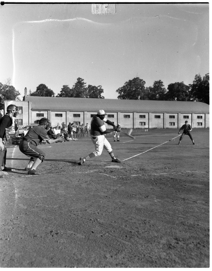 Nobody plays too close when Midland Flyers’ big Bob Grier is at bat. The big pitcher flied out to the center fielder on this attempt in the game against Civil Service at Town Park diamond Wednesday night.