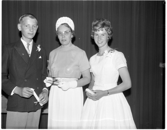 Graduation night brought a number of special awards to Parkview Public School pupils. In this picture, Mrs. C. L. Weckman presents Home and School Association merit awards to John Wilcox and Glenda Stewart.