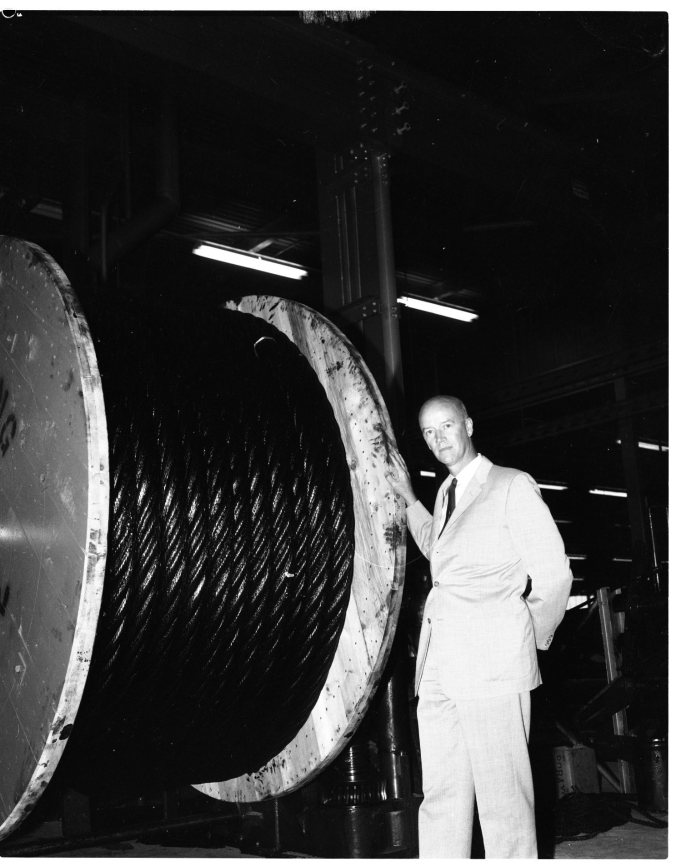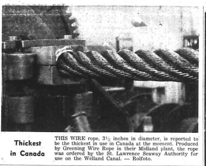 Not a small man, W. E. Brown, plant manager at Greening Wire, is dwarfed by the huge drum needed to carry the 3 1/2 inch diameter wire rope produced recently. Destined for use on the Welland Canal, the rope is the biggest, in diameter, of any used in Canada at the moment. Two ropes were produced, one 250 feet long and the other 230’ 6”.