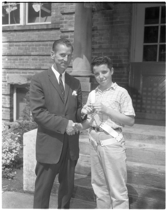 With school nearly over until September, officials have expressed satisfaction with the way the Midland public school safety patrols have operated since their inception in January. Above, Terry Turner captain of Bayview School patrol is presented with a pin by Norman Crane, Ontario Motor League representative in this area. Similar pins were given patrol members at all five Midland schools in appreciation of their work.