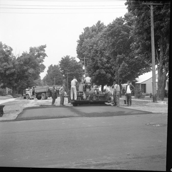 Despite heavy rain showers, workmen continued right on with Midland’s long-delayed paving program last week. Above, the paving machine is putting the finishing touches on the Russell and Robert Street corner.