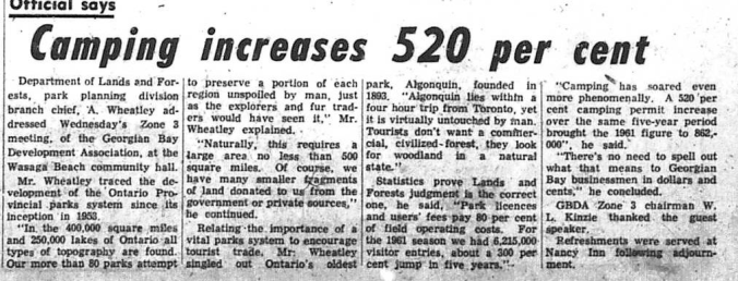 Department of Lands and Forest park planning division branch chief, A. Wheatley addressed Wednesday’s Zone 3 meeting, of the Georgian Bay Development Association, at the Wasaga Beach community hall. Mr. Wheatley traced the development of the Ontario Provincial parks system since its inception in 1953. “In the 400,000 square miles and 250,000 lakes of Ontario all types of topography are found. Our more than 80 parks attempt to preserve a portion of each region unspoiled by man. Just as the explorers and fur traders would have seen it.” Mr. Wheatley explained. “Naturally, this requires a large area no less than 500 square miles. Of course, we have many smaller fragments of land donated to us from the government or private sources,” he continued. Relating the importance of a vital parks system to encourage tourist trade, Mr. Wheatley singled out Ontario’s oldest park, Algonquin, founded in 1893. “Algonquin lies within a four hour trip from Toronto, yet it is virtually untouched by man. Tourists don’t want a commercial, civilized-forest; they look for woodland in a natural state. Statistics prove Lands and Forests Judgment is the correct one, he said, “Park licences and users fees pay 80 per cent of field operating costs. For the 1961 season we had 6,215,000 visitor entries, about a 300 per cent jump in five years. “Camping has soared even more phenomenally. A 520 per cent camping permit increase over the same five-year period brought the 1961 figure to 862,000’’, he said. “There’s no need to spell out what that means to Georgian Bay businessmen in dollars and cents,” he concluded.